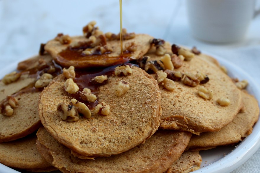 3. If desired, sprinkle pancakes with a dash of nutmeg and top with walnuts and a drizzle of maple syrup.