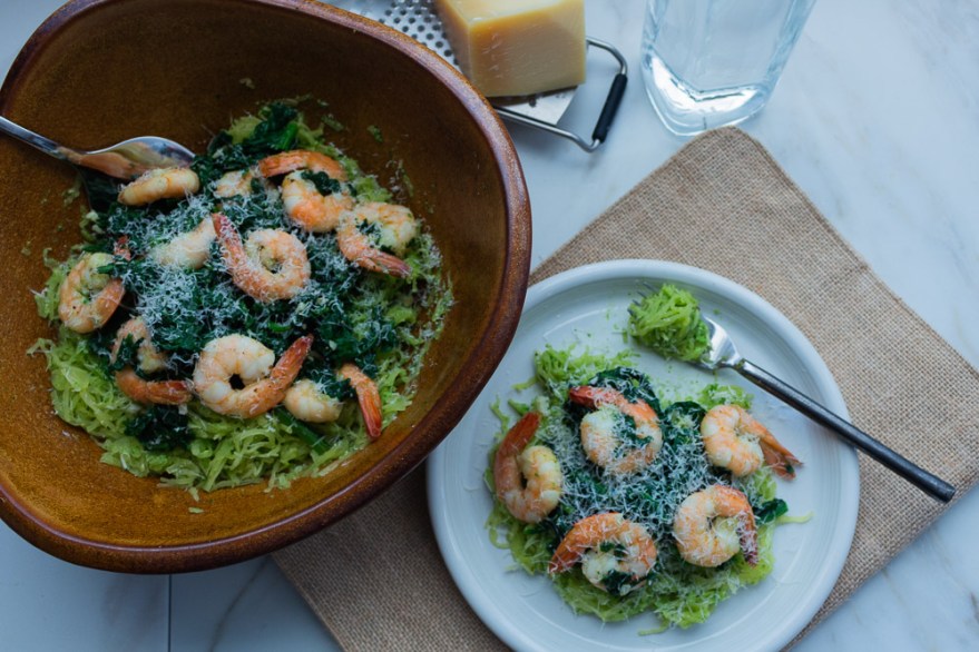 Pesto makes a great sauce for this quick vegetable “pasta” dish, topped with sautéed fragrant garlic, lean shrimp, nutritious spinach and nutty Parmesan cheese. I love big batches of homemade pesto when I have an abundance of basil in my container garden or CSA share. I freeze 1 tablespoon portions in mini-muffin tins to set and store in freezer safe containers to enjoy year round. Simply toss frozen pesto with warm spaghetti squash strands or pasta and stir as it melts and evenly coats.