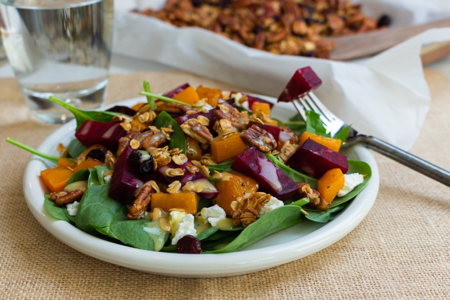 - Create a bed of spinach on four plates and top with an equal amount of roasted beets and squash. Crumble 1 ounce of goat cheese on each salad and sprinkle with my crunchy granola and a drizzle of vinaigrette.
