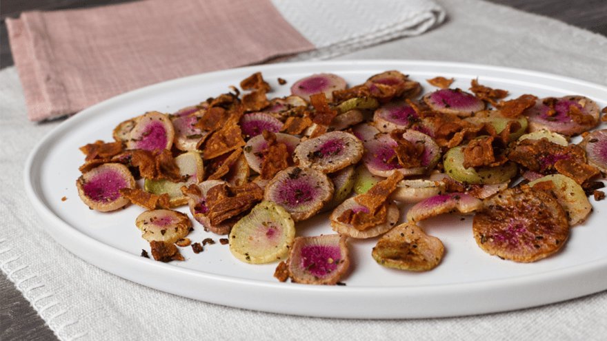 Radishes are a root vegetable you may not think of roasting, but be prepared to kick the potato, carrot, turnip and your other favorite root vegetables aside. I think radishes are meant to be roasted, which brings out a sweetness that mellows their peppery heat. Serve this earthy dish as an appetizer or side.