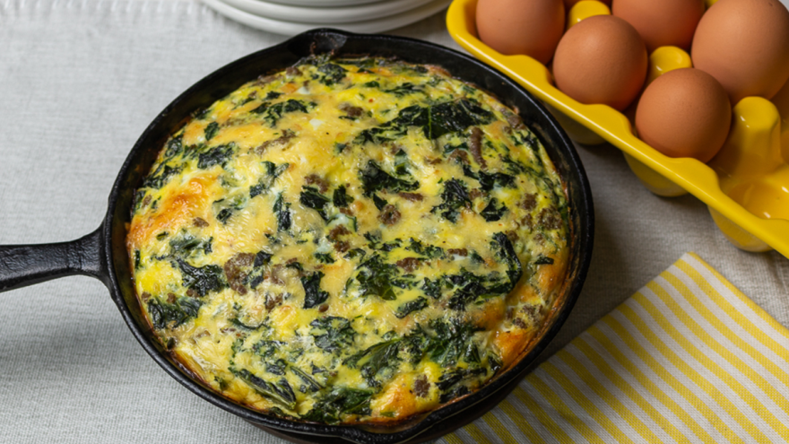 5. Pour egg mixture over kale and sausage and gently stir to evenly distribute. Let the eggs start to set for 1 to 2 minutes without stirring. Place skillet in the oven and bake for 20 to 25 minutes until the eggs are set and the frittata is lightly browned. Serve warm or at room temperature.