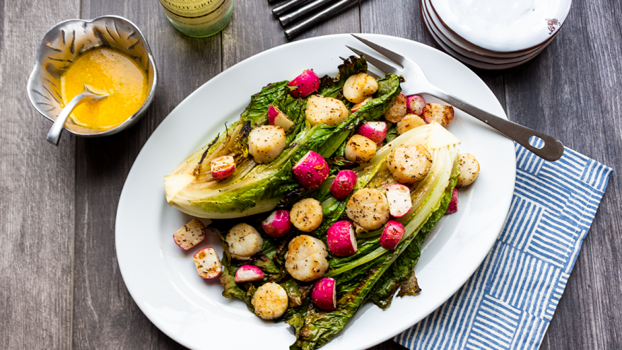 Firing up the grill is one of my favorite activities. I love it even more when I can cook my entire meal over the grill in a matter of minutes. I know, lettuce is not the first thing that comes to mind when you think of cooking out. However, this sweet and smokey salad with grilled radishes and scallops may become your favorite go-to dish. In less than 15 minutes, you will have a delicious meal for two that is perfect for enjoying on your patio with your favorite white wine. Cheers to fast and healthy seasonal meals.