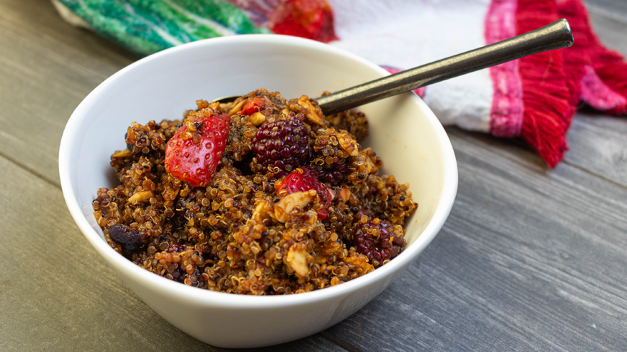 Hearty quinoa with its nutty flavor compliments sweet berries and crunchy almonds in this breakfast bowl that will keep you satisfied all morning. Substitute the strawberries and blackberries for any seasonal berry in your region of the world. Quinoa is a complete protein, offering all of the essential amino acids, making it a great choice for vegetarians. It’s also an excellent whole grain option for those with celiac or gluten sensitivities since it’s naturally gluten-free.