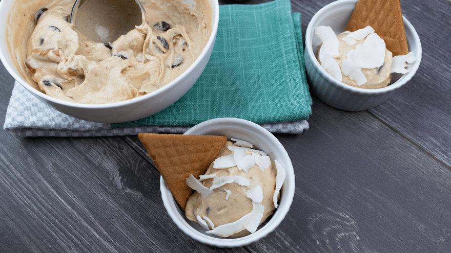 - Cover and freeze for an hour. Serve in bowls or in a cone and top with coconut flakes.