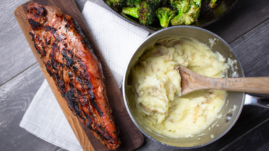 The aroma of grilled meat lofting in the air makes me hungry, even if I’ve already had a meal. Add a little bourbon, maple syrup and Dijon mustard in the mix, and the smell of your pork tenderloin on the grill may even bring your neighbors over for dinner. Paired with creamy goat cheese mashed potatoes, this recipe is simple enough for a throw-together meal and impressive enough to serve when entertaining. Doubling the recipe will give you more to pass around if you are serving a crowd. Add some grilled broccoli to round out this delicious meal and serve with your favorite bourbon of course.