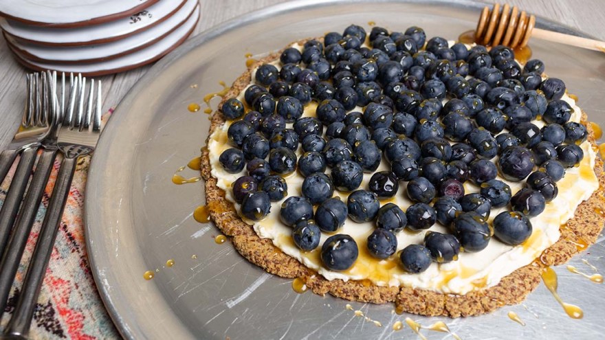 4. Remove pizza crust from oven and top with cream cheese spread. You may need to dip your spreading knife in hot water occasionally to help evenly distribute across the crust. Top with blueberries and drizzle with desired amount of honey. Serve immediately.