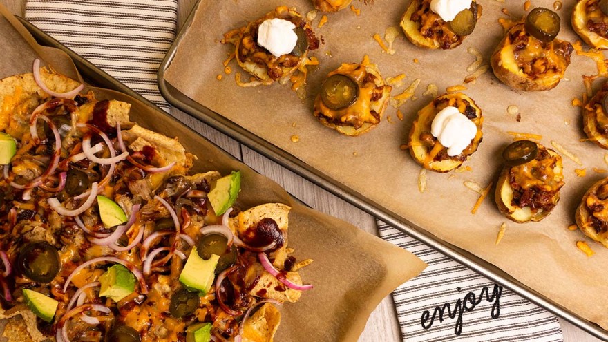 5. Bake potatoes and nachos for 7 to 10 minutes, until cheese has melted. Top potatoes with sour cream and nachos with diced avocado before serving.