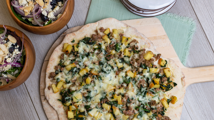 Fall is in the air and on my plate! Fresh picked apples bring the taste of the season to this grilled pizza. For a vegetarian version, simply omit the sausage and top with toasted pecans or walnuts for a crunchy protein after removing from the grill.