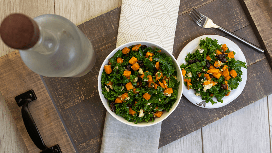 A little olive oil and balsamic vinegar go a long way when massaging kale, but I like to serve it with extra oil and vinegar at the table to let family or guests drizzle more if desired. Cranberries, blue cheese and roasted sweet potatoes turn this salad into a meal that’s satisfying enough on its own. It also makes a nice side dish with roasted turkey or pork tenderloin.