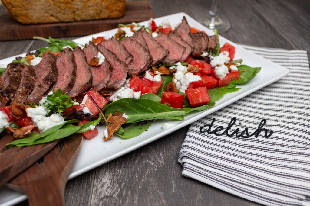 Meat lovers rejoice for this salad that was made for you. The classic bacon, lettuce and tomato (BLT) sandwich is one of my favorite meals to make with farm fresh tomatoes. As an alternative to this time-honored dish, I created a salad and took it up a notch by topping it with grilled steak and blue cheese dressing. This hearty salad is perfect for a relaxing summer weekend and pairs well with your favorite red wine.