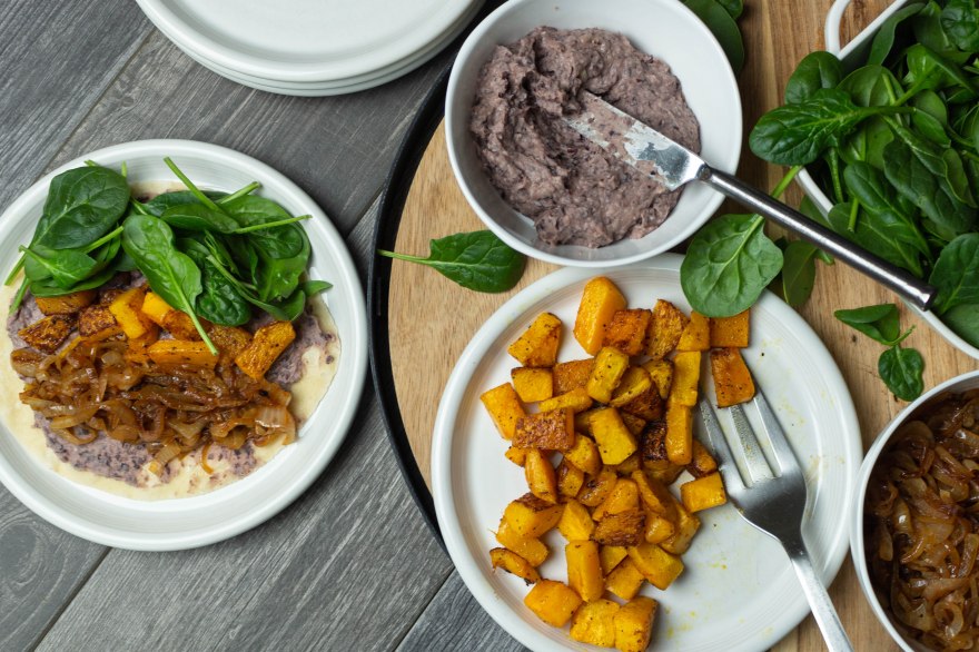 This colorful bowl of nutritious ingredients will brighten your mood, even on a cold and cloudy winter day. Enjoy it with ingredients warm from the oven and stove top or with chilled squash and onions that you have prepared in advance.
