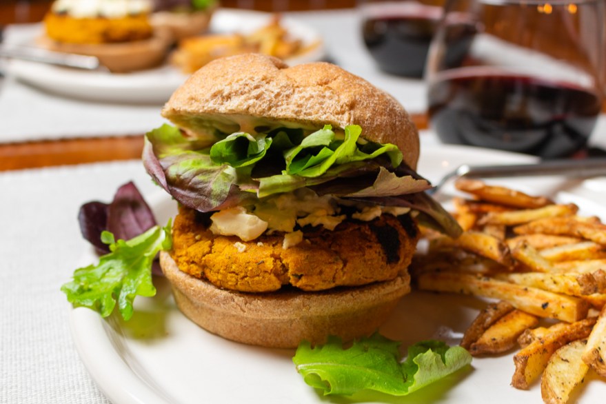 Butternut squash adds a touch of sweetness to this vegetarian burger as it compliments the nutty chickpeas, toasted walnuts, fried sage leaves and blue cheese. This hearty burger pairs well with homemade french fries or a simple side salad.