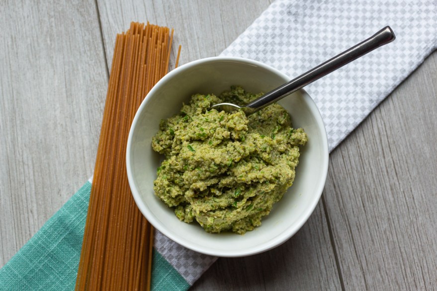 Fish, shrimp, beans and pesto make the most delectable combination in this heavenly bowl of soup that will have you reaching for leftovers. Go ahead, it is comfort food with a conscience packed with three types of lean protein and juicy tomatoes. When basil is in season and my CSA box is full of this aromatic green goodness, I make batches of pesto and freeze tablespoon-size portions using mini-muffin tins. I store them in a freezer-safe container and enjoy during winter months in recipes like this. Don’t have fresh pesto on hand? Store-bought pesto will also work well and taste delicious in this dish.