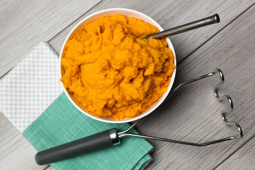 - Add roasted sweet potatoes, and stir to combine shrimp, vegetables and sauce, cooking for another minute.